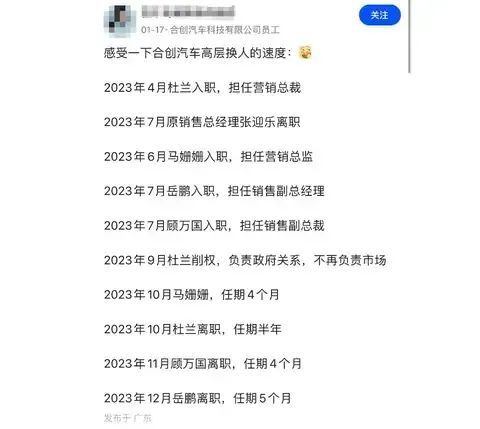先是在2024年年初,被一位认证为“合创汽车科技有限公司员工”的用户爆料,合创对高层进行大清洗。出任营销总监、销售副总经理、销售副总裁、营销总裁的管理层在2023年年底相继离职。