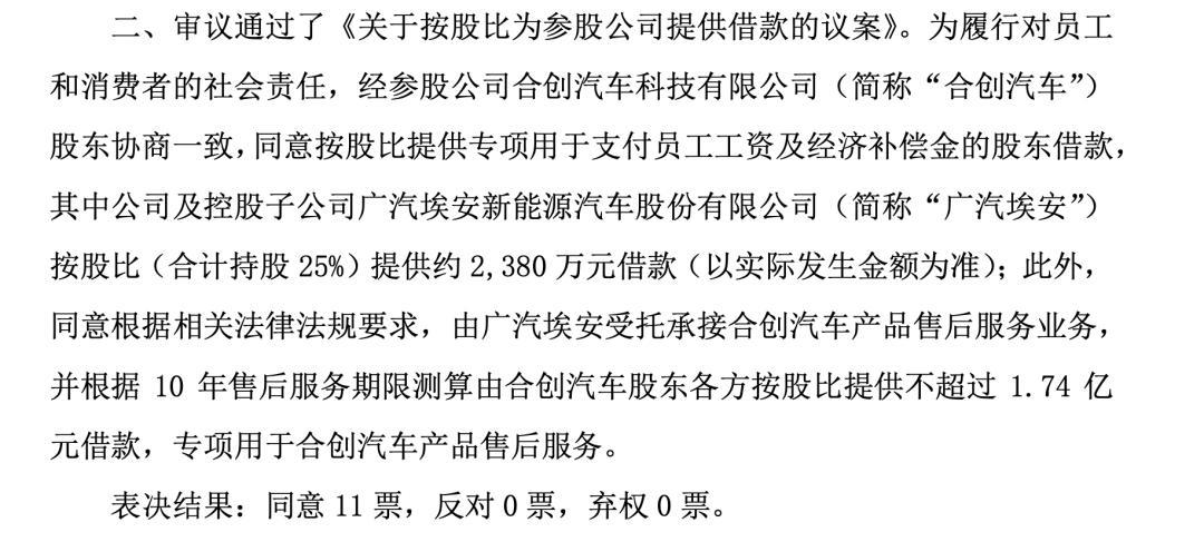 此外,广汽集团董事会同意根据相关法律法规要求,由广汽埃安受托承接合创汽车产品售后服务业务,并根据 10 年售后服务期限测算,由合创汽车股东各方按股比提供不超过1.74亿元借款,专项用于合创汽车产品售后服务。