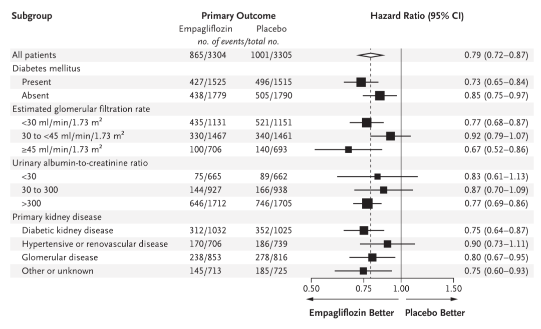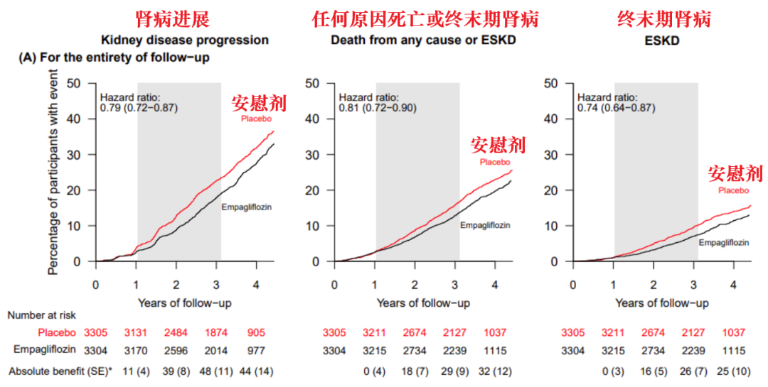 恩格列净组3304例患者中有865例(26.2%)发生肾脏进展或心血管原因死亡(主要结局),而安慰剂组3305例患者中有1001例(30.3%)发生了主要结局,恩格列净组发生肾病进展风险或心血管原因死亡的风险降低21%。