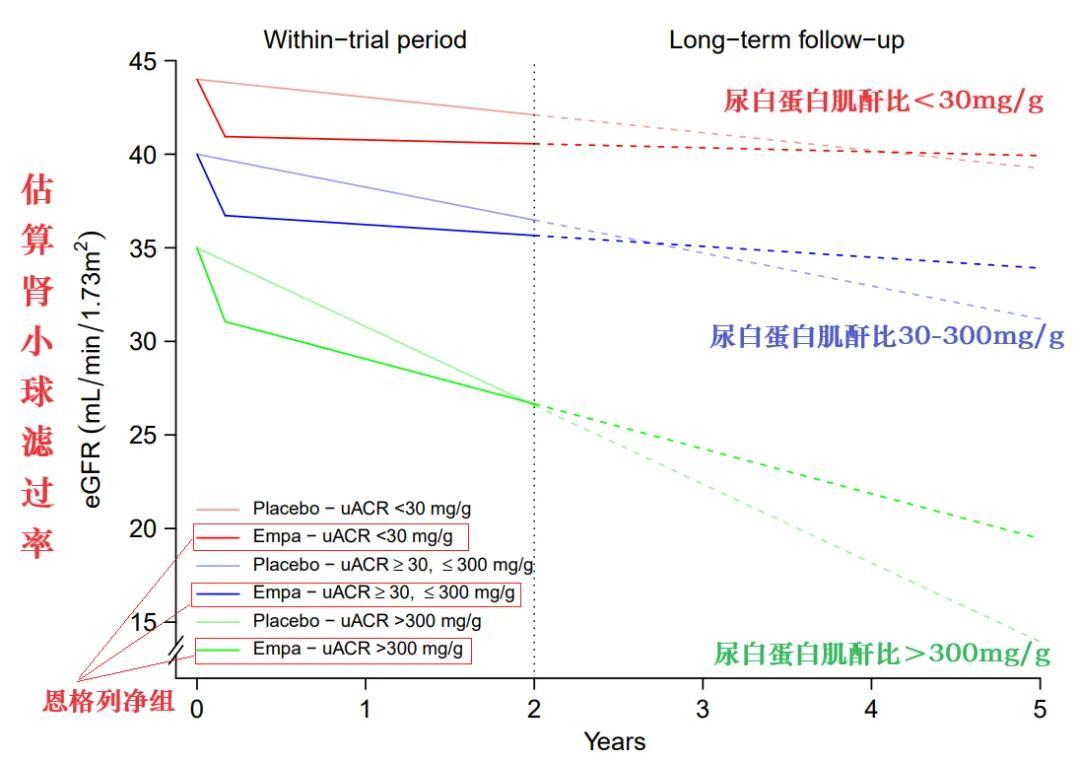 该临床试验结束后,试验组停用恩格列净,安慰剂组停用安慰剂,研究者们进一步对比了停药后2组患者的肾功能差异,又随访了2年。