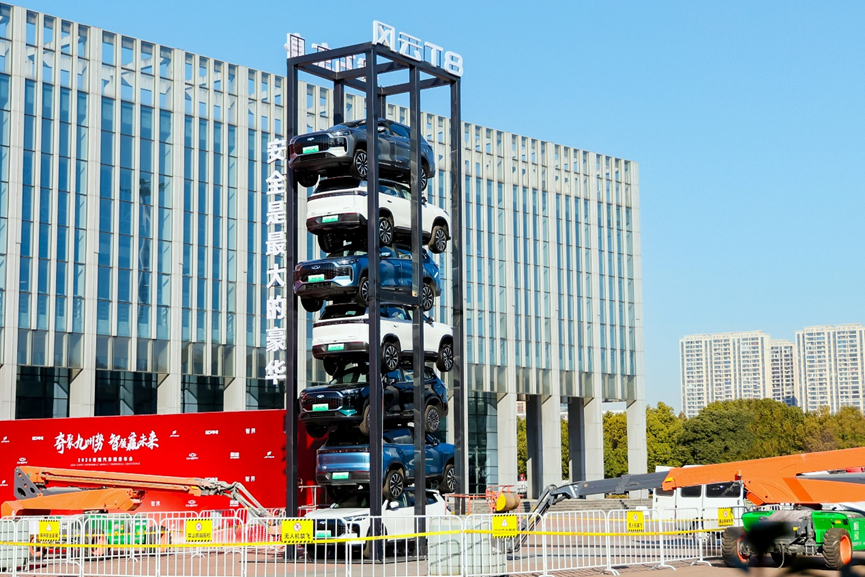 在发布会现场上,风云T8进行了新能源汽车首次挑战6倍自重的安全测试。7辆风云T8叠成高度超10米的“车塔”,位于最下方的风云T8负重超过10吨,相当于顶住了近4头大象的重量。经过超72小时的严苛测试,风云T8无明显结构变形,彰显了其硬核安全实力。