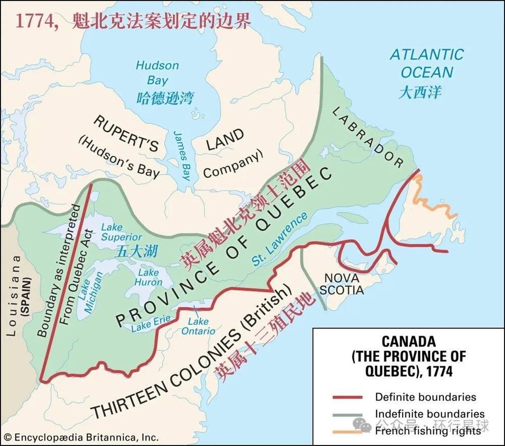 美利坚合众国建国之前加拿大的雏形也已形成,图:Quebec Act