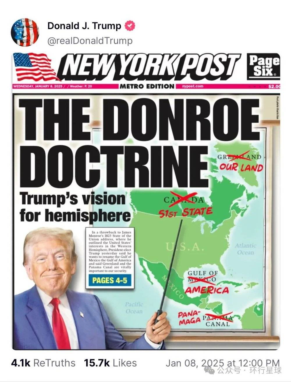 按照特朗普的计划四分之一个地球即将改变,图:Truth Social