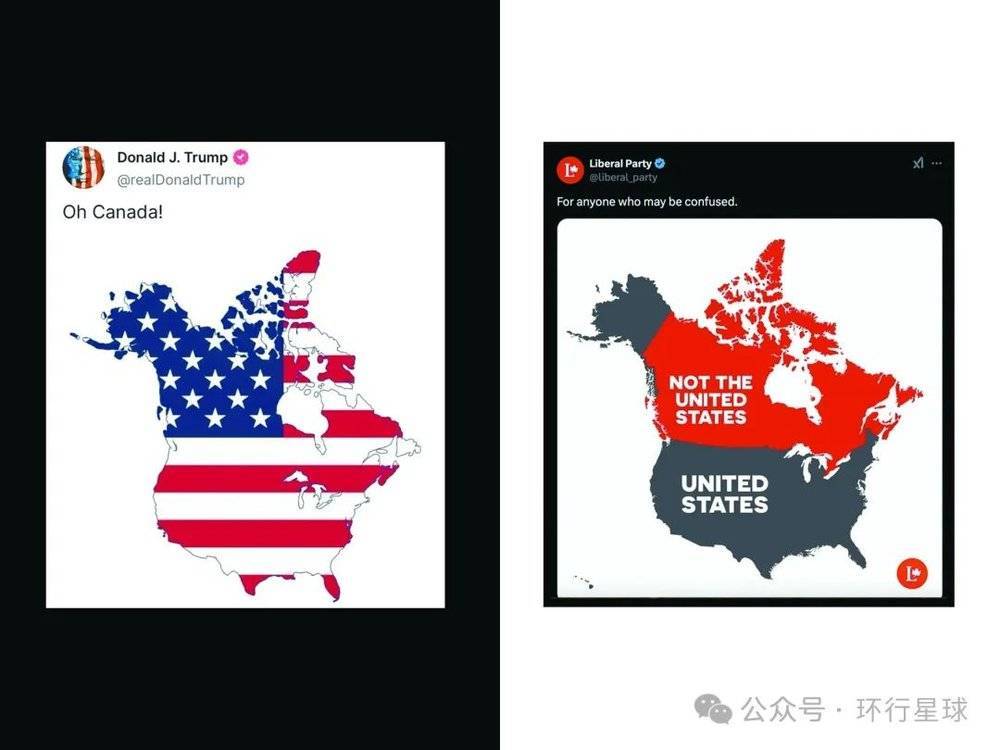 特朗普和加拿大执政党联邦自由党前后在社交媒体上发地图,宣示(反)吞并决心