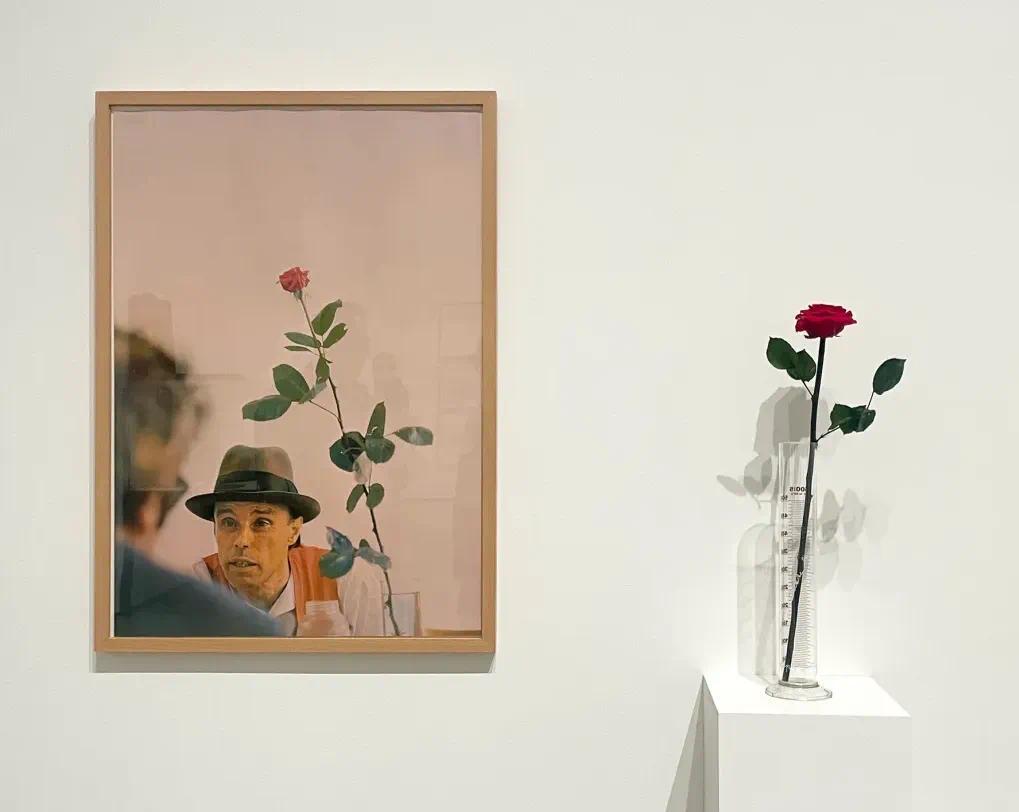 ▲ 约瑟夫·博伊斯,(左)"ohne die Rose tun wir's nicht"(没有玫瑰我们就不干)(1972 年),彩色胶印在卡片纸上,手写文字;(右)"Rose für Direkte Demokratie"(直接民意的玫瑰)(1973 年),带刻度的玻璃圆柱体,有题词;证书印在打印信纸上(未显示)