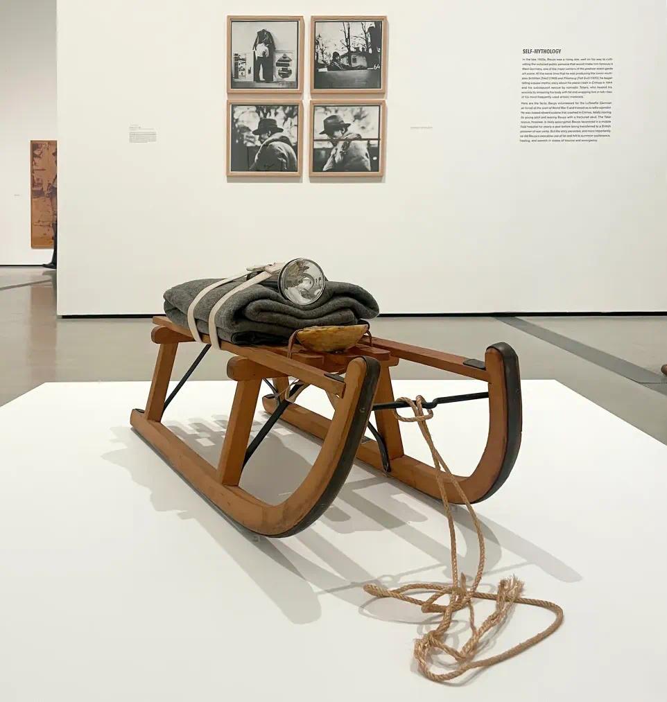 ▲ 约瑟夫·博伊斯,"Schlitten"(雪橇)(1969 年),木制雪橇、毛毡、皮带、手电筒、脂肪、绳子;雪橇上印有油画颜料(照片来自 Renée Reizman/Hyperallergic)