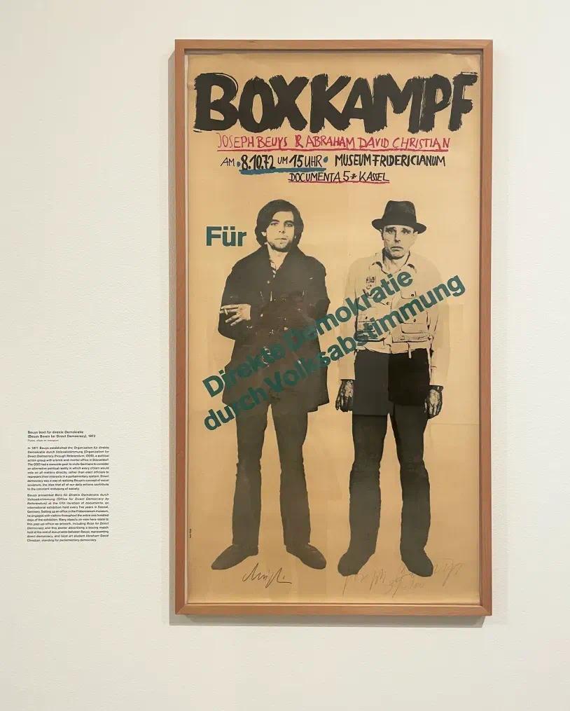 展览的核心部分通过一系列雕塑、表演和互动装置,观众不仅是旁观者,更成为艺术创作的一部分。策展人安德烈·乔治(Andrea Gyordy)和莎拉·罗耶尔(Sarah Loyer)精心布置的展区,让人仿佛置身于博伊斯的思想世界中。特别是“Beuys boxt für direkte demokratie”装置,观众可以参与到模拟的民意决策过程中,体验博伊斯对直接民意的推崇。