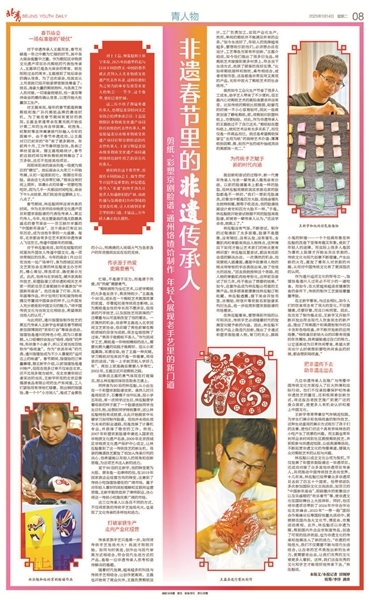 这三位小伙子都是非遗传承人,也都是北京民间文艺家协会的理事或会员:王磊是朝阳区非物质文化遗产项目孙氏剪纸的代表性传承人;林泓魁是北京市级非物质文化遗产项目彩塑京剧脸谱的代表性传承人;王新宇则是北京市级非物质文化遗产项目通州饹馇饸制作技艺的第五代传承人。