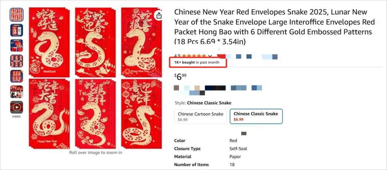 在消费端,在以美国消费者为主的某电商平台上,各式各样的春节装饰品和节日用品已上架,其中蛇年红包袋、对联、窗花装饰、巧克力金币等多种产品在近一个月均有多条商品链接销量超过1000件。