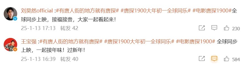 影片官博晒出海报写道:“全球贺新春,阖家看唐探!电影《唐探1900》全球同步上映,更多国家及地区待解锁,一起感受年味,迎福接贵!除夕晚上年夜饭,大年初一看唐探!”