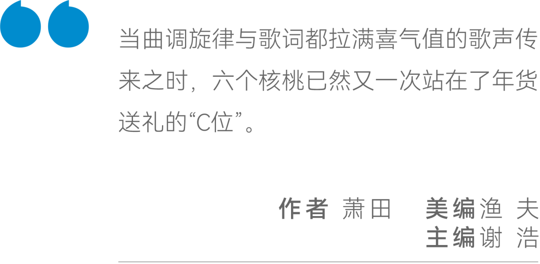 当曲调旋律与歌词都拉满喜气值的歌声传来之时,六个核桃已然又一次站在了年货送礼的“C位”。
