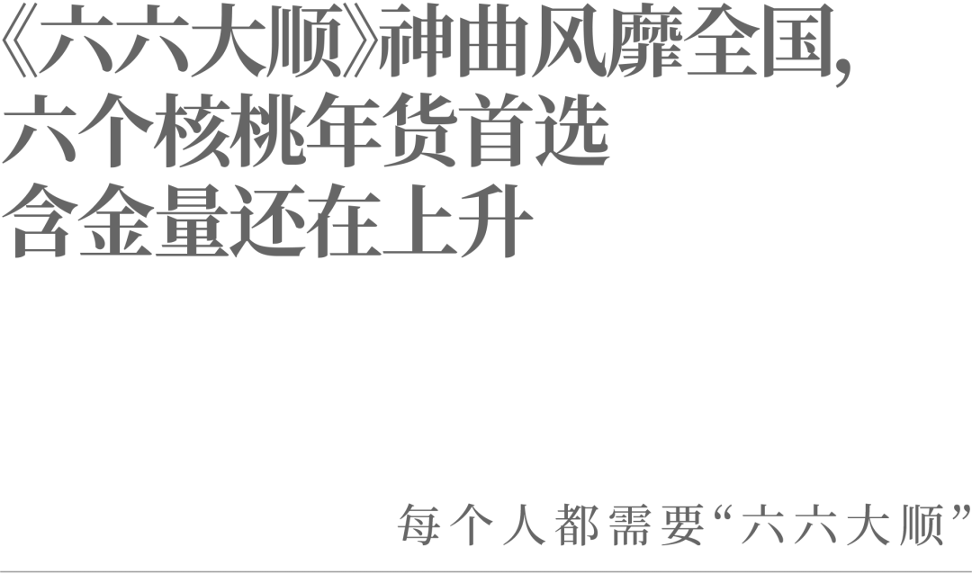 无论是“六”还是“顺”,再到身体顺、家庭顺、财运顺,寥寥几个字里藏着中国人对新一年的祈愿密码。在“六六大顺”这个关键词上,六个核桃早已经树立了一种超级心智。