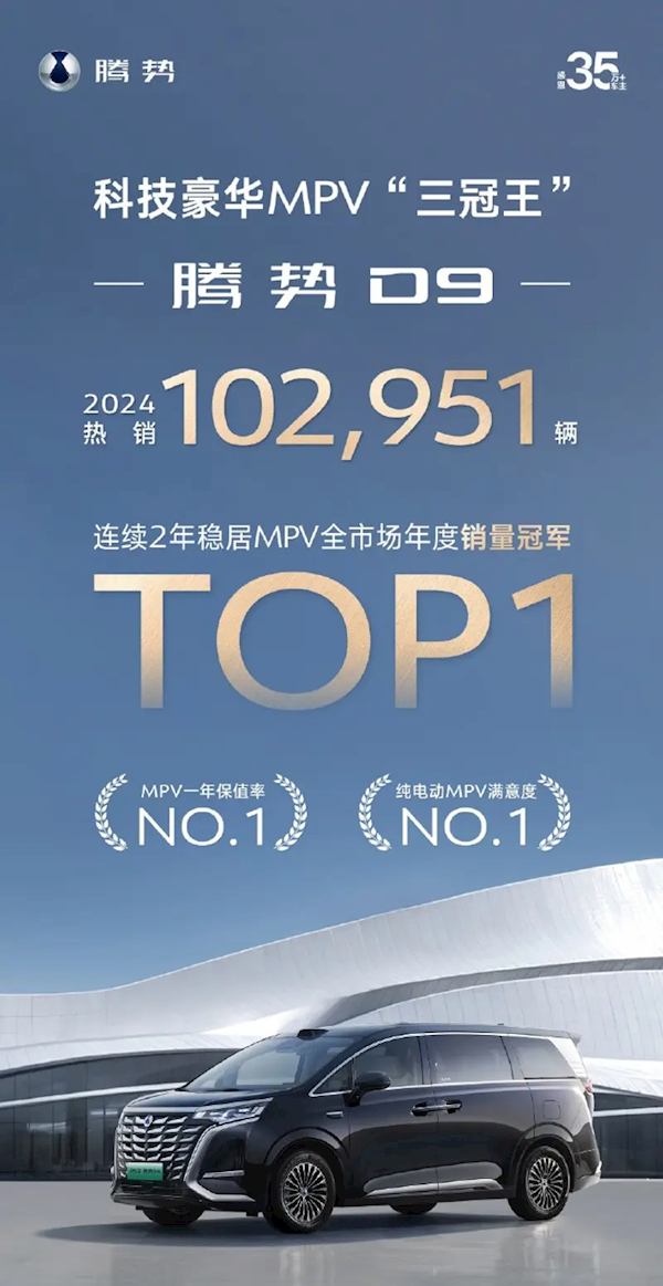 腾势汽车宣布,腾势D9在2024年的全年销量达到了102,951辆。