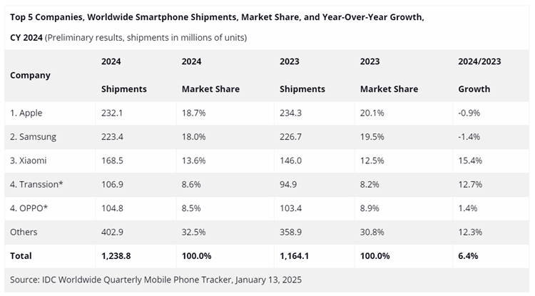 国际数据公司IDC公布2024年智能手机出货量达到12.4亿部,相较2023年同比增长6.4%。在市场份额排名上,苹果力压三星,连续两年成为全球第一。