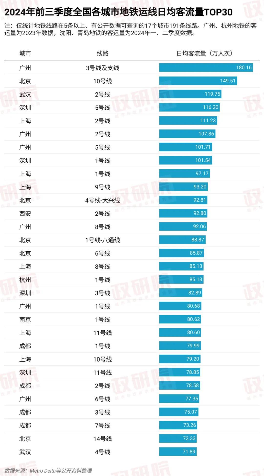 政研院通过公开资料整理了全国17个城市、191条地铁线路的日均客流量。其中,广州地铁3号线的日均客流量为180.16万人次,居全国之首,是广州地铁中最繁忙的线路。广州地铁3号线及支线的日均客运量占广州地铁日均客运量的21%,这意味着,广州平均每5个人乘坐地铁,就有1个人要乘坐3号线。
