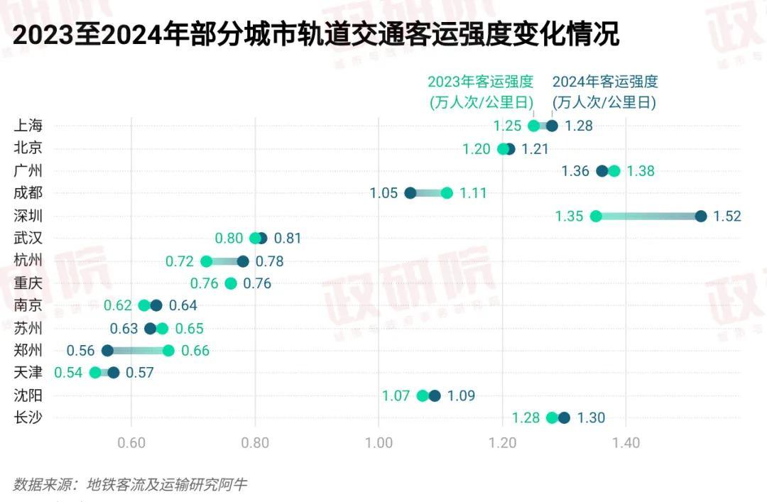 数据显示,在2023年,广州地铁的客流强度为1.38万人次/公里日,位居全国第一。深圳以0.01的微弱之差次于广州,客流强度为1.35万人次/公里日,是全国地铁第二挤的城市。但刚刚过去的2024年,深圳以1.52万人次/公里日的地铁客流强度反超广州,问鼎中国地铁客流强度第一城,成为全国地铁最拥挤的城市。广州、长沙分别以1.36万人次/公里日和1.3万人次/公里日的客流强度,分列全国地铁最拥挤城市榜单的第二和第三。