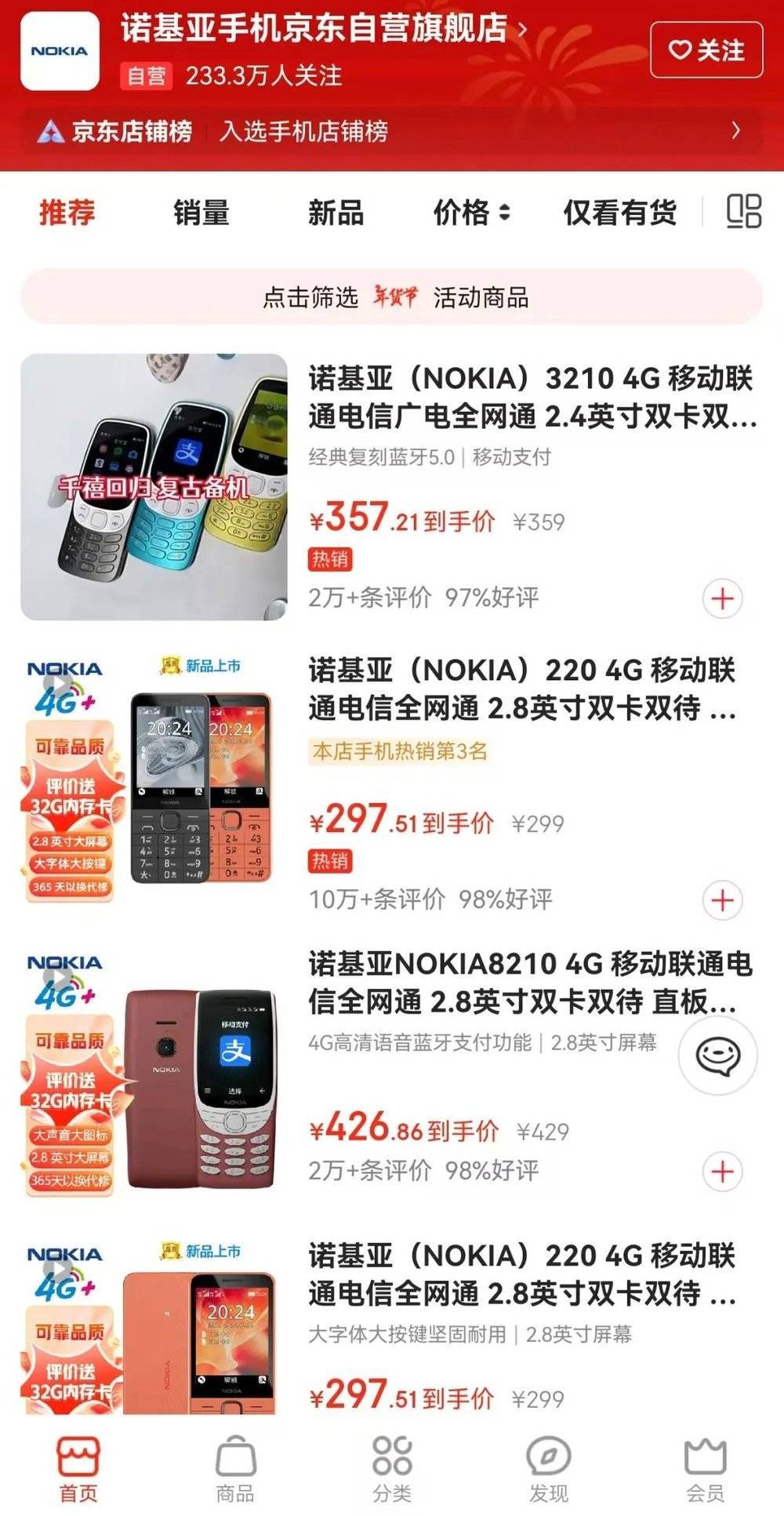 在淘宝、京东等电商平台上,诺基亚3210如今仍然在售,售价359元起,以“学生备用机”“戒网神器”为卖点,在诺基亚官方旗舰店内有5000多台的销量。而销量最高的是“老人机”诺基亚105,售价为149元,累计销量突破4万台。