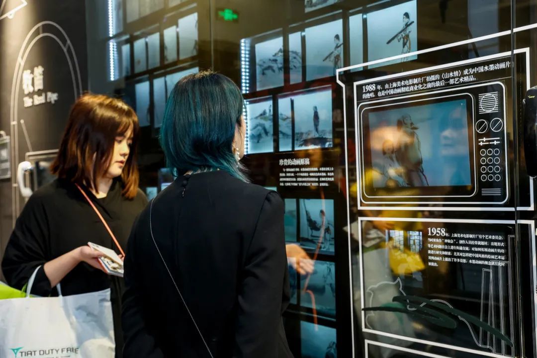这面墙的对面,就是中国水墨动画专区,一整面展墙陈列的都是上世纪中国水墨动画的代表。