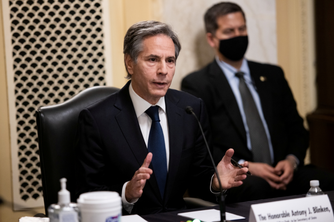 2021年1月19日,布林肯在美国国会大厦参议院外交关系协会举行的国务卿确认听证会上发表讲话