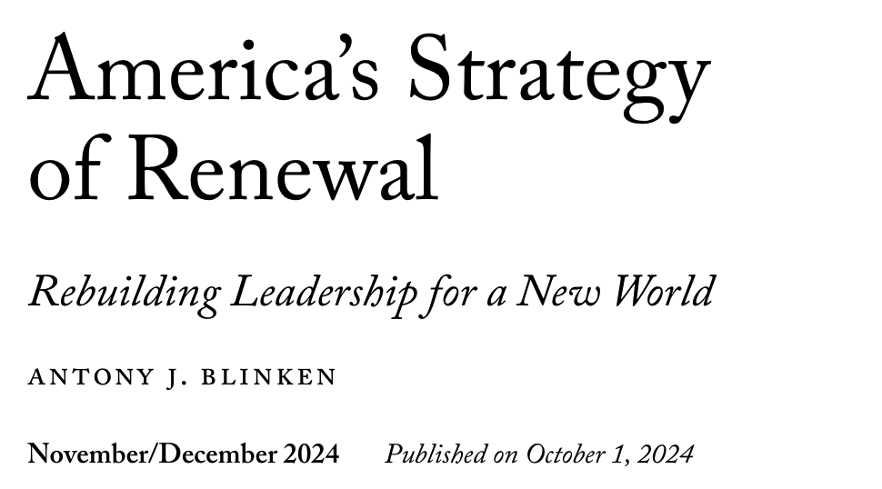 2024年10月1日,布林肯在《外交事务》上撰文《美国的更新战略》