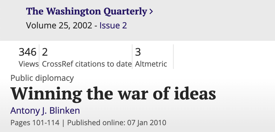 2002年,布林肯在《华盛顿季刊》发文阐述“观念战争”的重要性