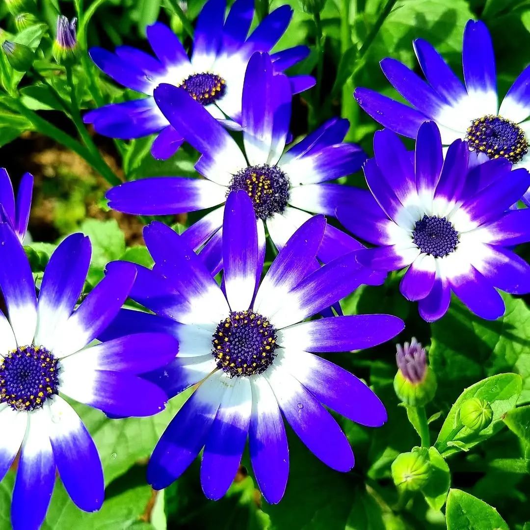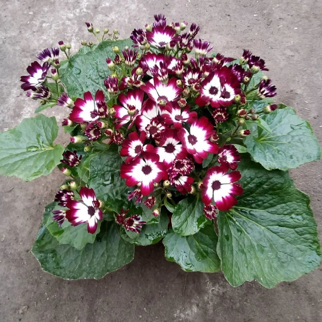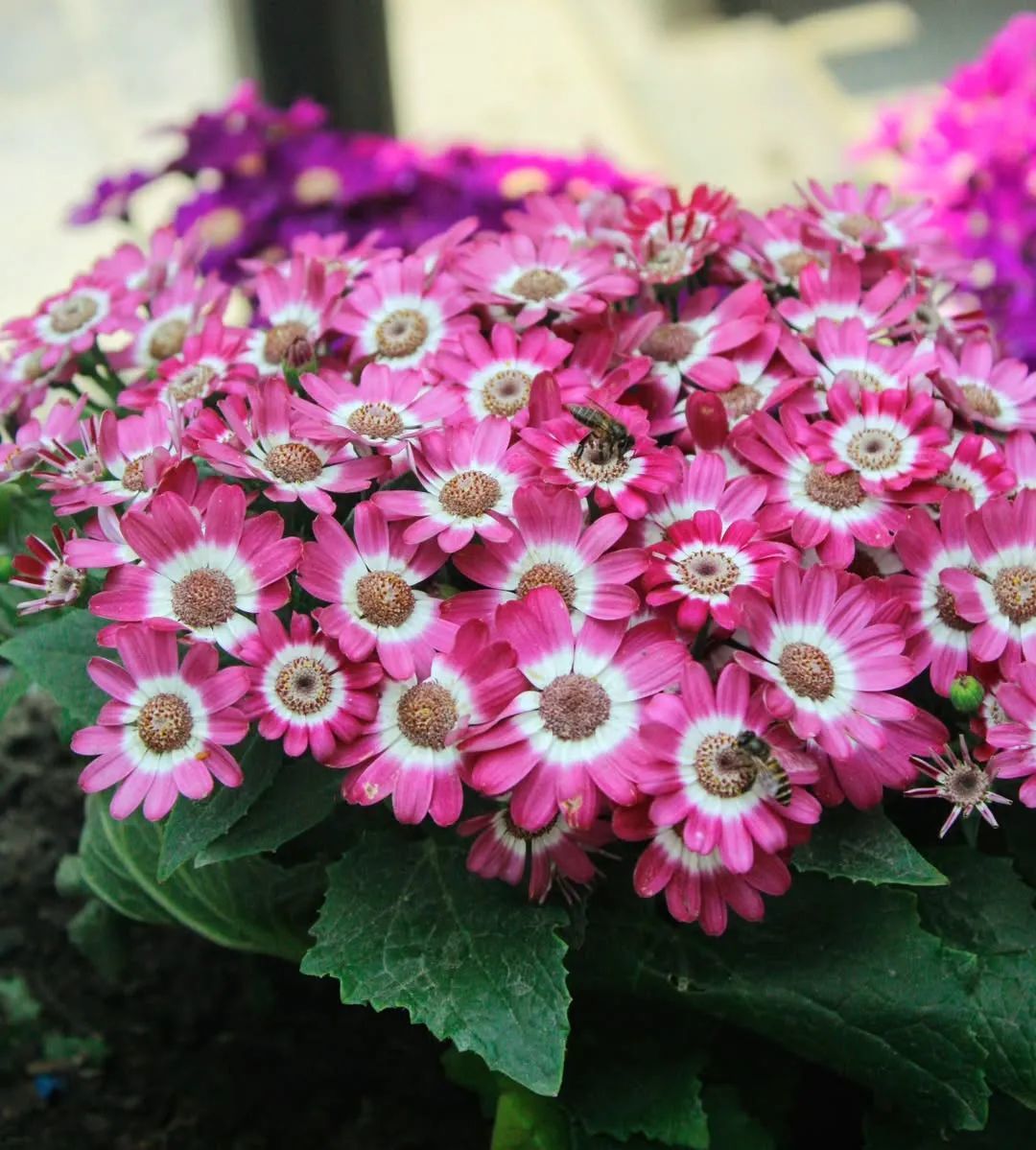 瓜叶菊的株形饱满,开花时就是郁葱葱的花球,花色迷人,花色特丰富,有常见的红色、紫色、粉色、蓝色、白色和各种混色的品种,最显眼的特征就是花瓣中心处有各种环形的斑纹和斑点,花瓣的背面甚至有绒光。