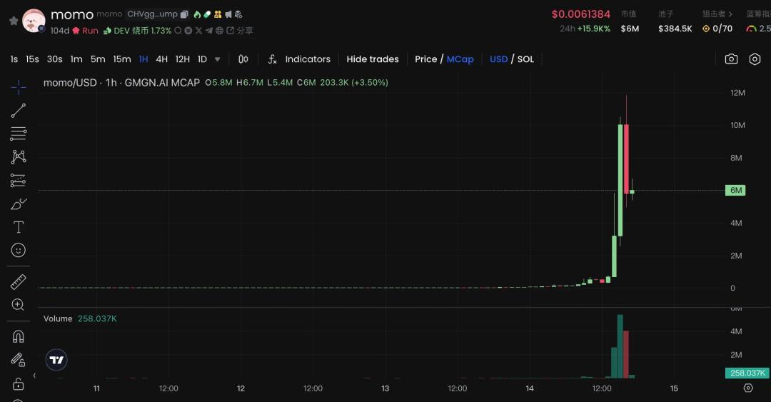 根据 GMGN 数据,momo 代币目前价格暂报 0.006 美元,市值暂报 600 万美元,此前一度涨至 1200 万美元左右。