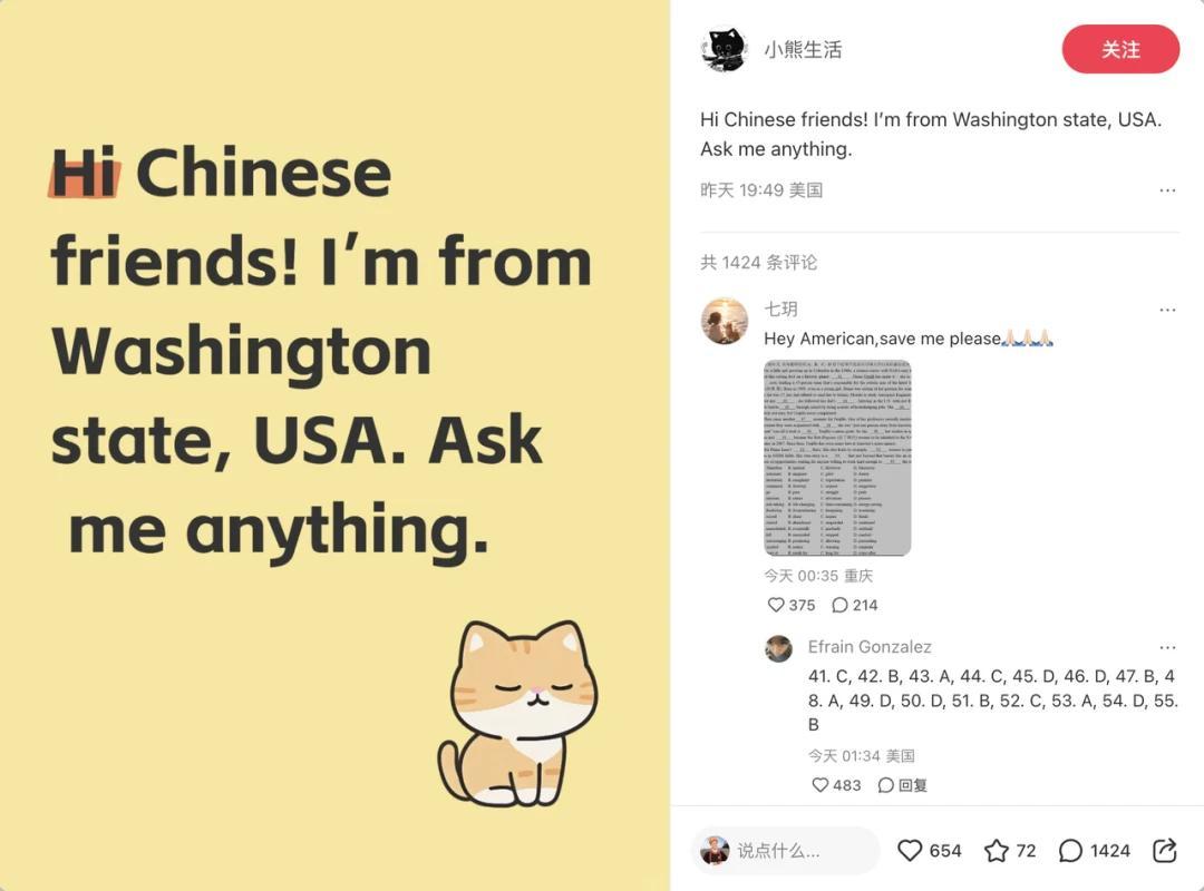 随着越来越多的 TikTok 用户的进入,中文互联网用户对老外们的好奇心也与日俱增,为了更好地在小红书上和中国网友们交流,有老外直接开启了“AMA”,大有一副“我就在这,你随便问”的敞亮架势。