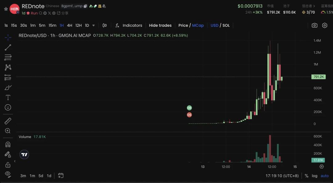 根据 GMGN 数据,目前 REDnote 价格暂报 0.00079 美元,市值暂报 80 万美元左右。
