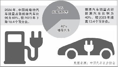混动增速,纯电放缓——2024年新能源汽车市场发展出现了这样一个明显特征。中国汽车工业协会13日发布的最新数据显示,2024年中国新能源汽车销售1286.6万辆,同比增长35.5%。其中,纯电动汽车销量占比为60%,较前一年下降10.4个百分点;插混汽车销量占比则较2023年上升10.4个百分点,突破40%。