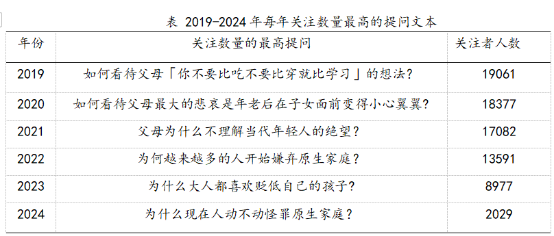 2019年至2024年期间,青年网民在父母关系提问中展现出更加深入的理性思考。从每年关注数量最高的提问来看,这一时期的提问更多涉及青年网民对家庭关系中的代际差异以及社会文化背景的深层次洞察与思考。“一方面希望孩子有出息,一方面又不停地贬低、否定孩子,剥夺孩子的自信。” “很多父母的通病:千百年来,都没有把孩子当正常人看……准确地说,是把孩子当成一个拥有喜怒哀乐,正常人格的人看,即使他们表现的很爱子女。”这样的讨论常常会上升到对于社会长期形成的固有观念与权力结构的反思,“中国式关心,用大白话说,这就是不是真正的关心,它是一种,戴上了关心的帽子,以关心之名,通过否定别人来给自己带来地位提升或情绪价值的行为。”