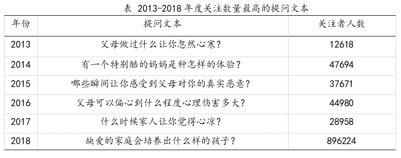 2013年到2018年期间,青年网民在知乎平台上关于父母关系的提问更注重情感体验的直接表达。从表中每年关注数量最高的提问来看,这一时期的讨论主要集中在负面情感体验和个人心理感受上,“心寒”、“心理伤害”等词汇的运用,表明用户在这一时期更倾向于表达对父母的负面情感反应。