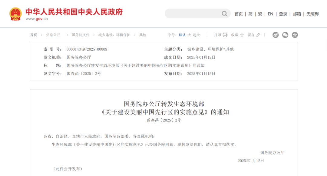 生态环境部《关于建设美丽中国先行区的实施意见》已经国务院同意,现转发给你们,请认真贯彻落实。