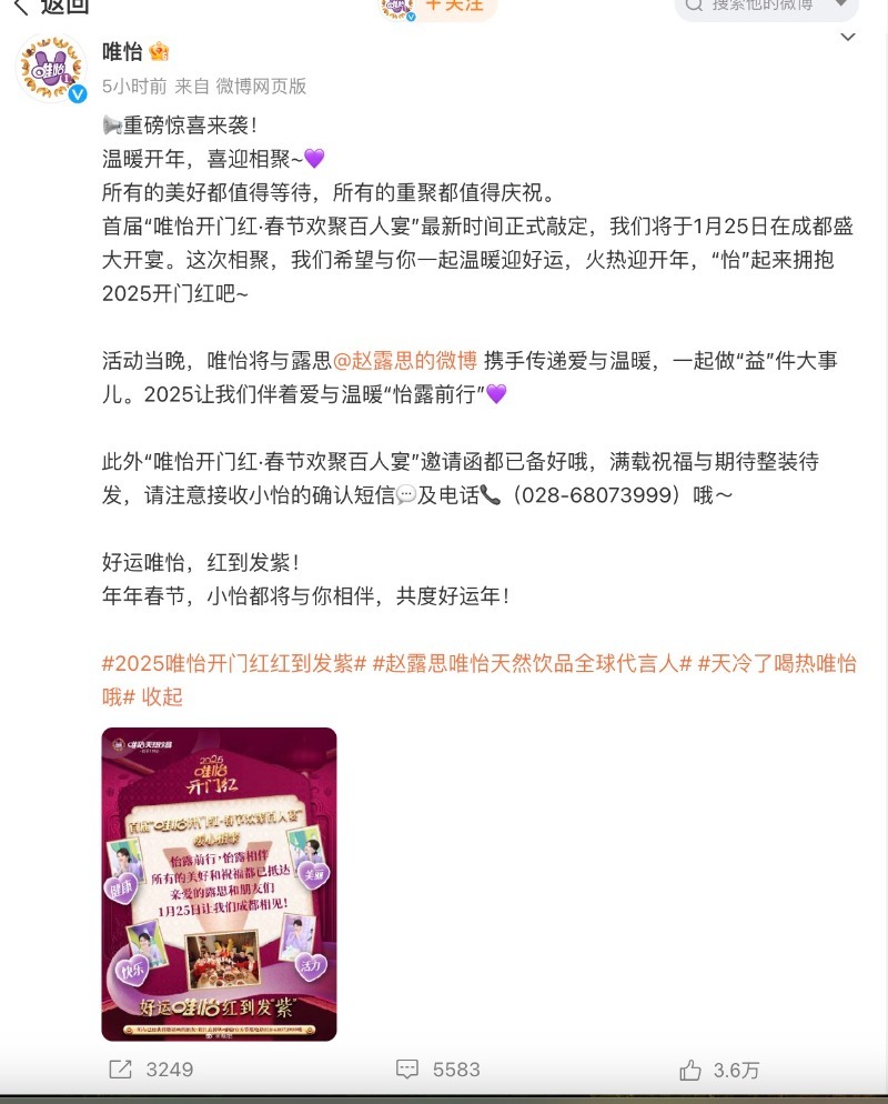 唯怡品牌官宣1月25日将在成都与赵露思携手举办活动。图/社交平台截图