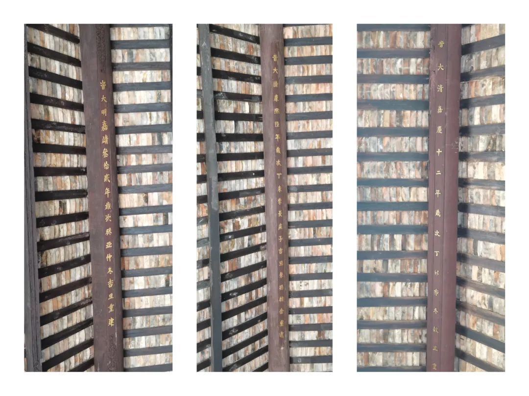 第三进脊檩下刻阳文“时大清康熙六年岁次丁未季夏庚子吉旦众孙捐金重建”(1667 年);