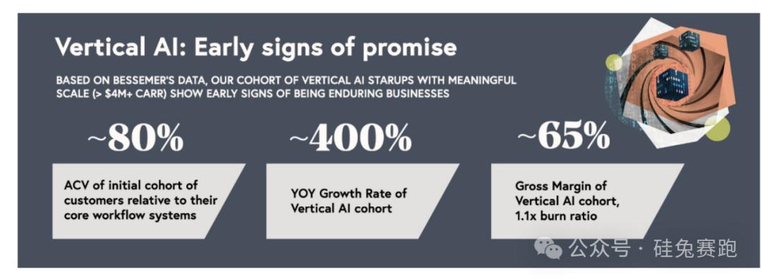 更振奋的是,自2019年以来成立的这批新兴垂直AI软件公司ACV已经达到了传统垂直SaaS软件的80%。ACV是指一个客户合同在一年内的总价值,是评估SaaS公司收入和预测未来收入增长的重要指标之一。同时,这些新兴的垂直AI软件公司还保持着400%的增速和约65%的毛利率。