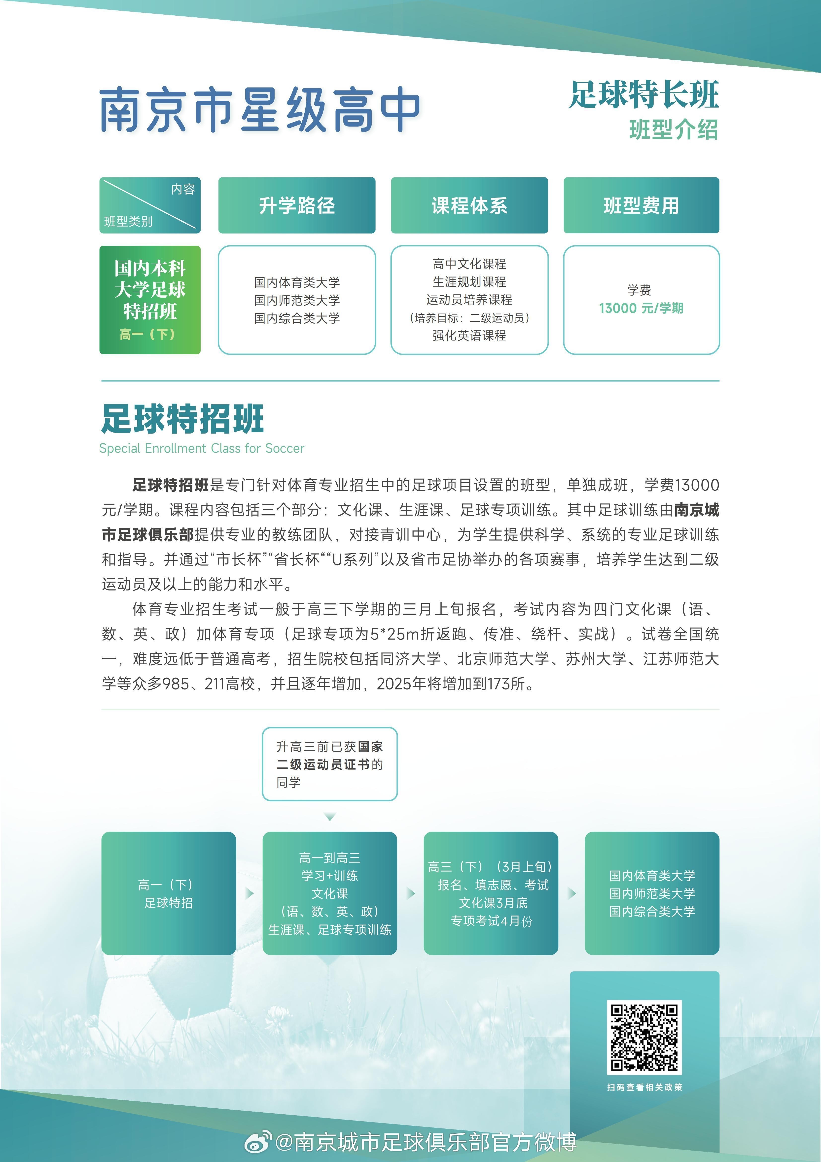 2.第二类:共建足球人才。选拔有潜力的足球运动员,进入南京市星级中学足球特招班学习。通过俱乐部与南京市星级高中合作,依托俱乐部的专业训练体系、赛事资源和学校的教育资源,接受系统的足球训练和文化教育,为其进入各类大学打下坚实的基础。(详情见附件)