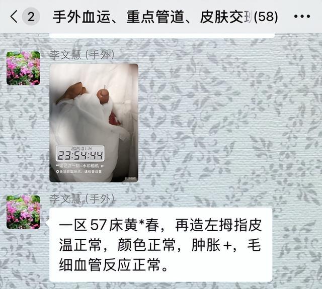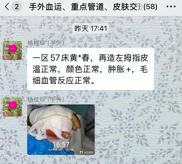 术后,手足显微外科护理团队严格监测着黄大哥新拇指的状况。每隔几个小时,医护人员就通过科室群组汇报患者的病情进展,确保一切都在掌控之中。目前,令人欣慰的是,黄大哥的左拇指再造部分皮温正常,颜色稳定,初步恢复状况良好。