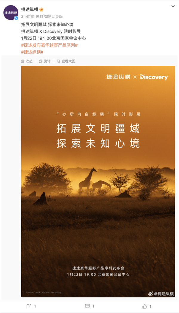 快科技1月16日消息,奇瑞旗下捷途汽车宣布,将于1月22日19:00举行新品发布会,届时将推出全新豪华越野系列——捷途纵横,首车定位豪华越野SUV,对标坦克700。