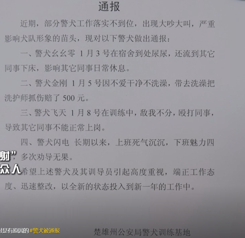前几天刷到了楚雄州公安局警犬训练基地发布的通报内容,怪有意思的。