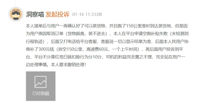 DoNews1月16日消息,在黑猫平台,有货拉拉司机投诉平台不支持空跑补贴,将司机的利益完全置之不理,导致自己被平台扣除行为分10分。