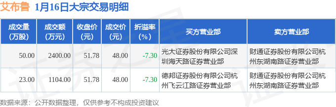 证券之星消息,1月16日艾布鲁发生大宗交易,交易数据如下: