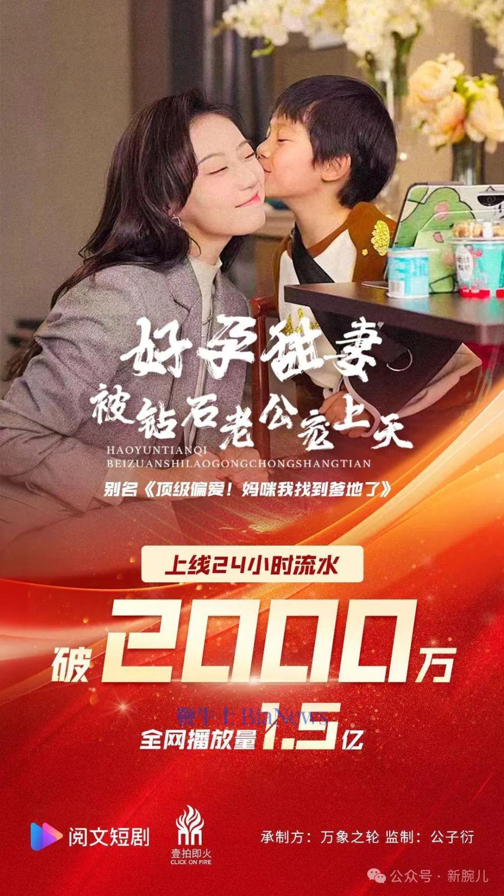 1月16日消息,阅文方面发布的海报显示,由阅文短剧出品的《好孕甜妻被钻石老公宠上天》(又名《顶级偏爱!妈咪,我找到爹地了》)上线24小时流水破2000万元。