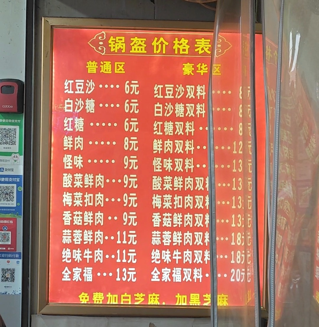 只见墙面的一侧贴着价格栏,不同馅的锅盔价格从6元~13元不等,可免费加白芝麻或黑芝麻。价格栏下面还有一行黑色的小字:“人在外遇到困难是难免的,如果你真的需要,请你小声告诉我,我能给你一顿温饱。”