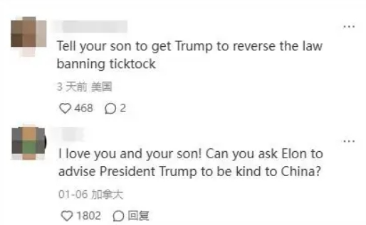 此外,还有网友让梅耶·马斯克给她的儿子马斯克传话,让马斯克劝劝川 普,“撤销禁用TikTok的法案”和“对中国好点”。
