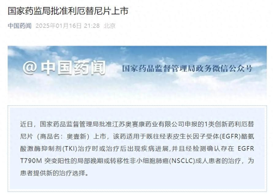 1月16日,据中国药闻:近日,国家药品监督管理局批准江苏奥赛康药业有限公司申报的1类创新药利厄替尼片(商品名:奥壹新)上市,该药适用于既往经表皮生长因子受体(EGFR)酪氨酸激酶抑制剂(TKI)治疗时或治疗后出现疾病进展,并且经检测确认存在 EGFR T790M 突变阳性的局部晚期或转移性非小细胞肺癌(NSCLC)成人患者的治疗,为患者提供新的治疗选择。