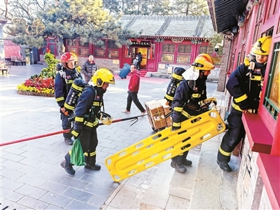 在当天的演习过程中,北青报记者看到,消防救援人员迅速展开火情侦察,有序组织应急疏散,熟练进行控火灭火操作,全力遏制火势蔓延。整个演习过程贴近实战,进一步提升了对人员密集景点和节庆活动场所火灾事故的应对能力。