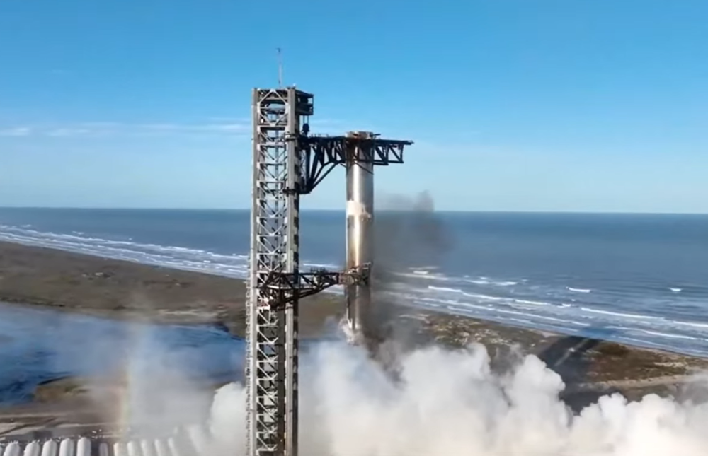 2024年10月13日,星舰进行第五次测试飞行。在星舰发射约6分50秒后,发射塔架上的捕获装置首次成功抓住了从天而降的几百吨重的助推火箭,这是人类首次用这种方式回收火箭,网友形象地称之为“筷子夹火箭”。