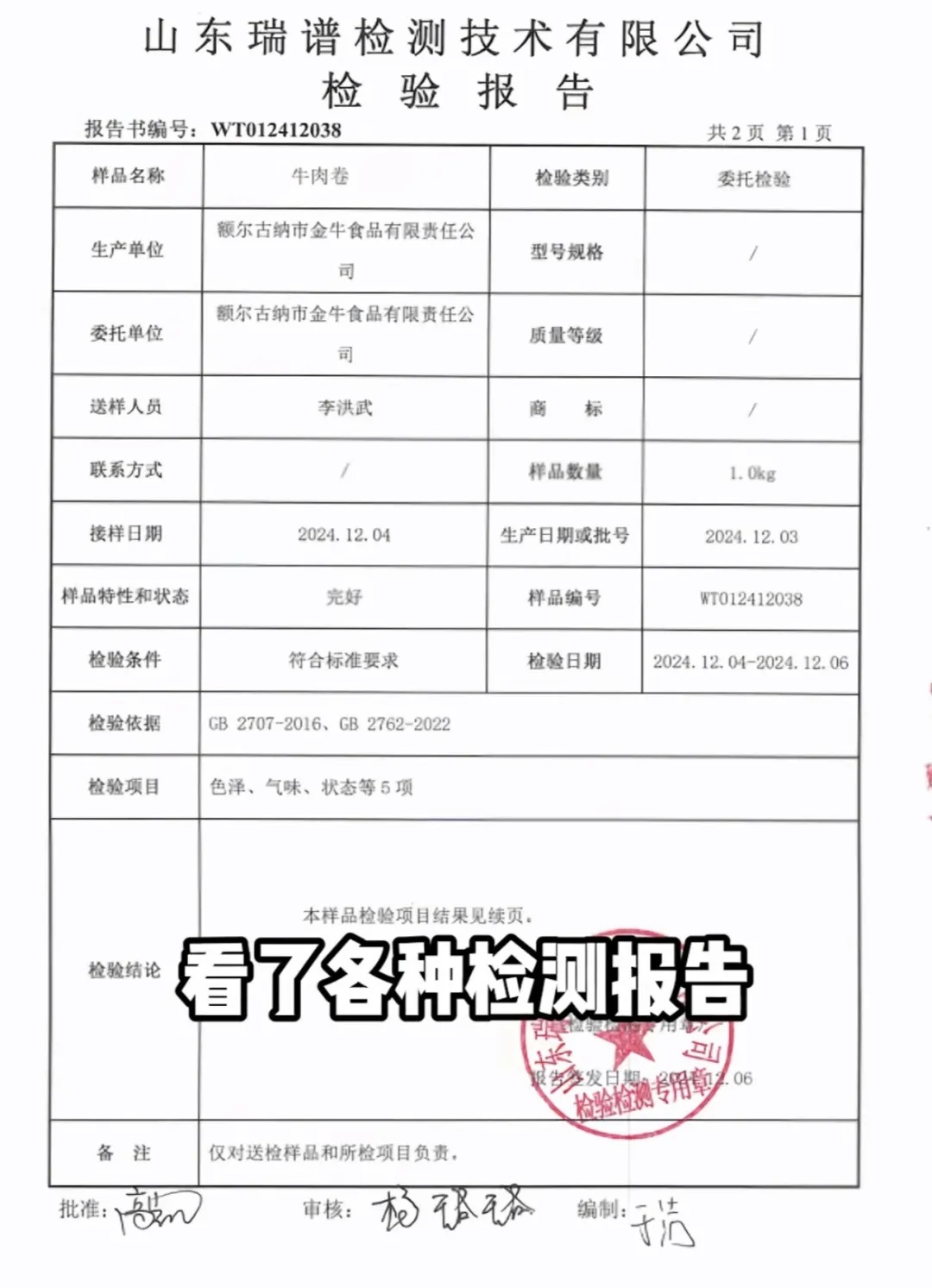 同时,李维刚也在视频里晒出了经销商出示给他的检测报告,报告显示生产单位和委托单位均为额尔古纳市金牛食品有限责任公司。