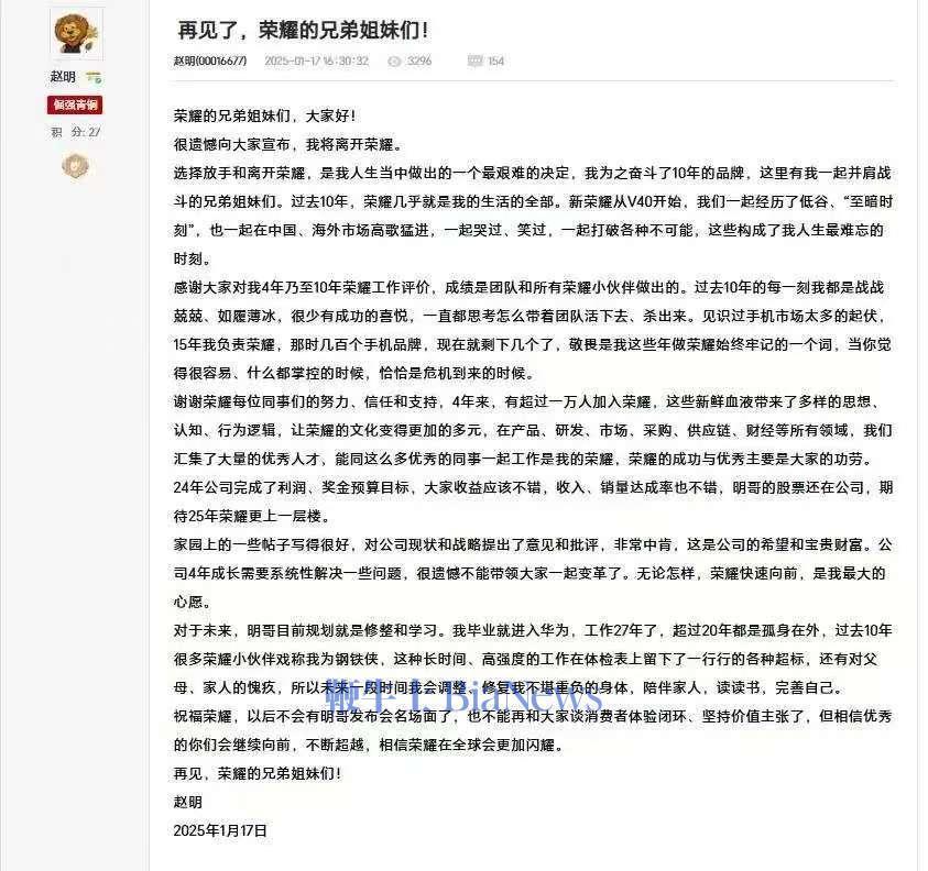 24年公司完成了利润、奖金预算目标,大家收益应该不错,收入、销量达成率也不错,明哥的股票还在公司,期待25年荣耀更上一层楼。家园上的一些帖子写得很好,对公司现状和战略提出了意见和批评,非常中肯,这是公司的希望和宝贵财富。公司4年成长需要系统性解决一些问题,很遗憾不能带领大家一起变革了。无论怎样,荣耀快速向前,是我最大的心愿。